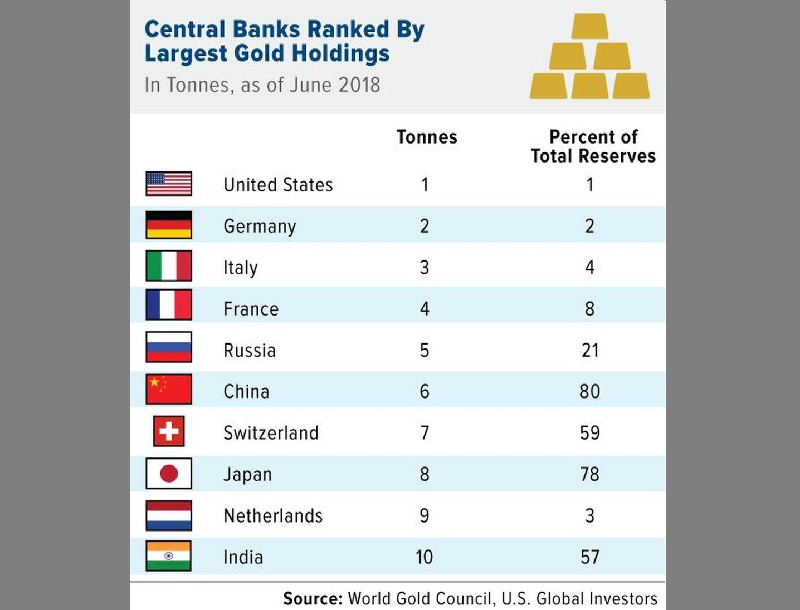 ১০. ভারত: স্বর্ণের দাম বাড়লেও ২০১৮-এর তুলনায় ২০১৯ সালে অনেক বেশি স্বর্ণ সঞ্চয় করেছে ভারত। ২০১৮ সালে সঞ্চিত স্বর্ণের পরিমাণ ছিল ৫৬০.৩ টন, ২০১৯-এ সমীক্ষার রিপোর্ট জানাচ্ছে, স্বর্ণের পরিমাণ বর্তমানে ৬১৮ টন। স্বর্ণ সঞ্চয়ের নিরিখে ভারত বিশ্বের নবম দেশ।